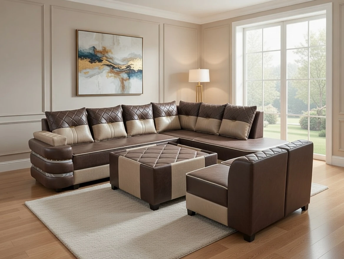 A bold and sophisticated sectional sofa set crafted in rich midnight brown and soft beige tones. Featuring quilted diamond-pattern back cushions, sleek layered arm detailing, and smooth curved edges, this design combines modern elegance with exceptional comfort. The matching tufted ottoman enhances the coordinated look, making it a perfect statement piece for contemporary living spaces that seek style, durability, and refined luxury.