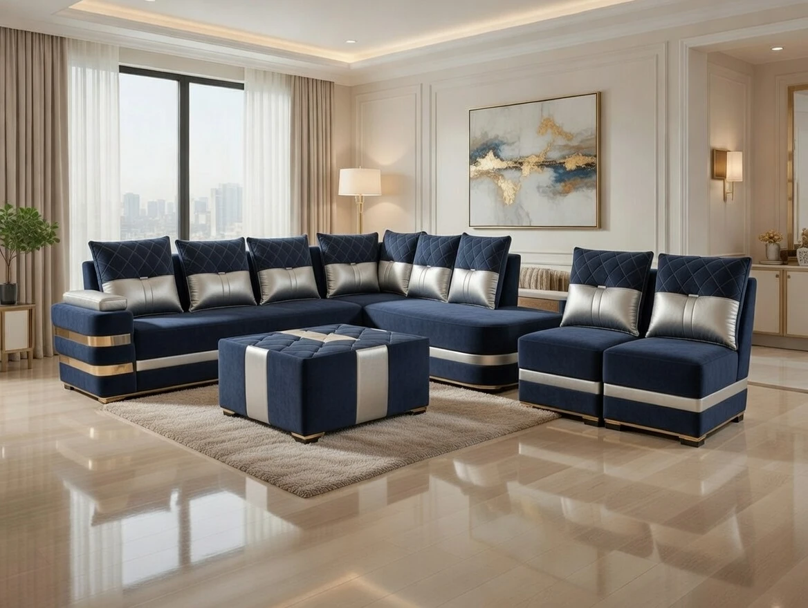 A refined blend of deep blue and soft beige tones, this elegant sectional sofa set delivers both comfort and contemporary sophistication. Designed with quilted back cushions, supportive seating, and sleek gold accent bands on the armrest, it creates a bold yet balanced aesthetic. The matching ottoman and accent chairs complete the ensemble, making it a perfect centerpiece for spacious living rooms that value warmth, style, and everyday luxury.