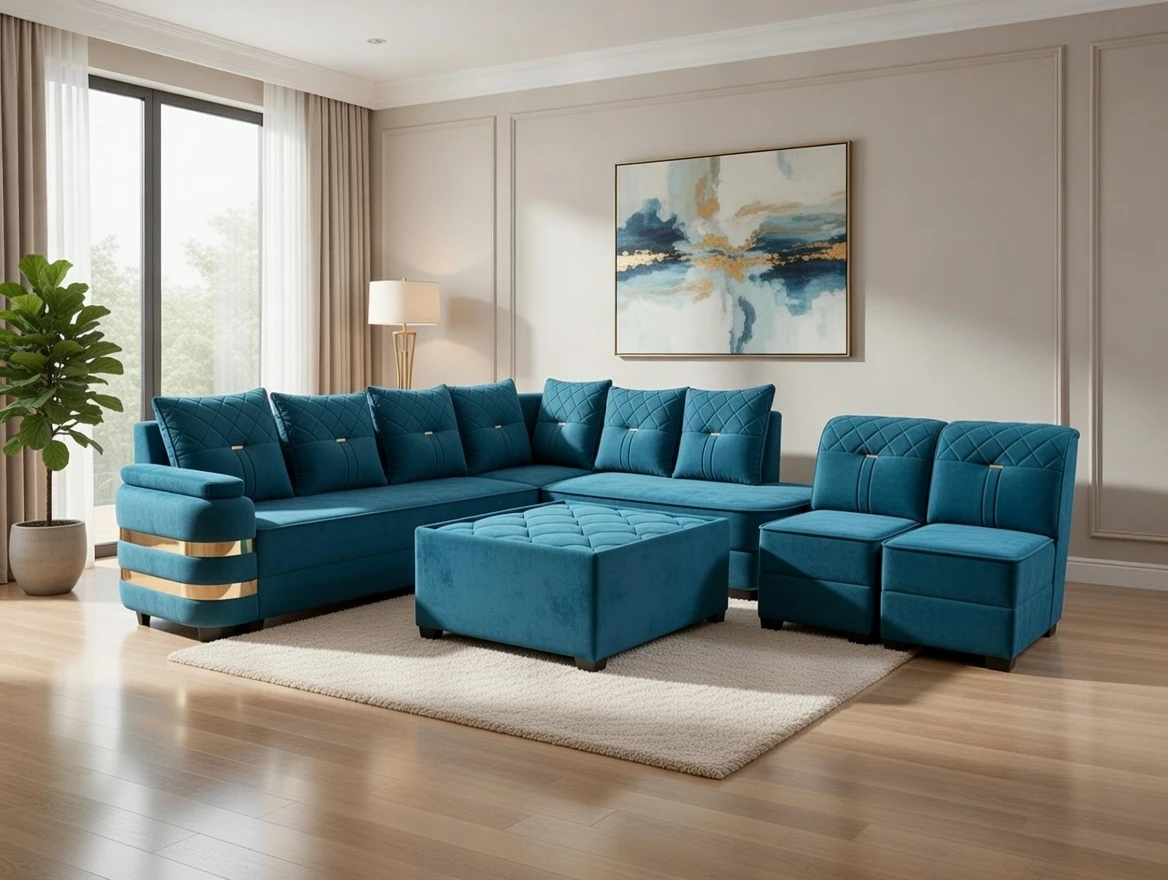 A stunning teal velvet sectional sofa set designed to bring sophistication and comfort into your living space. Featuring quilted detailing, plush cushions, and elegant gold accent bands on the armrests, this contemporary piece blends modern luxury with cozy functionality. Paired with a matching ottoman and armchair, it creates a harmonious and inviting atmosphere perfect for both relaxing evenings and stylish entertaining.