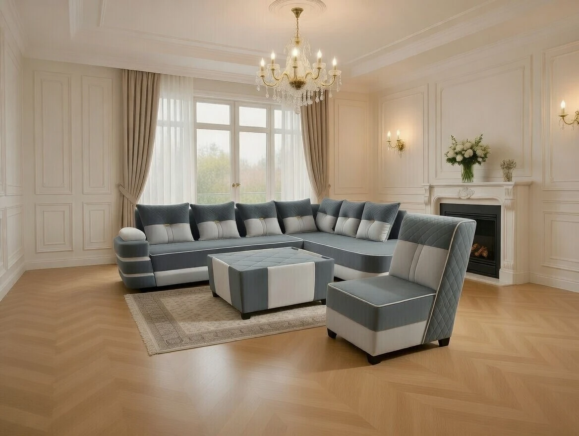 A stylish L-shaped sectional sofa set featuring soft grey and white upholstery, paired with a matching ottoman and accent chair. The design blends modern comfort with classic interior elegance, highlighted by a chandelier, decorative wall panels, and warm wooden flooring. Perfect for creating a spacious, inviting living area with a refined, high-end look.