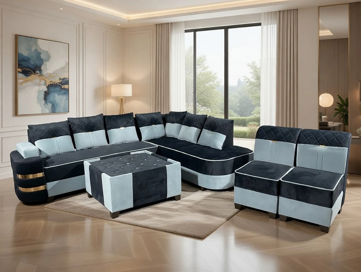 A stunning deep blue and sky sectional sofa set that exudes elegance and modern sophistication. Designed with diamond-quilted back cushions, plush seating, and bold gold accent bands on the armrest, this set creates a luxurious focal point in any living space. The matching ottoman and coordinated accent chairs complete the ensemble, offering both style and comfort for refined contemporary interiors.