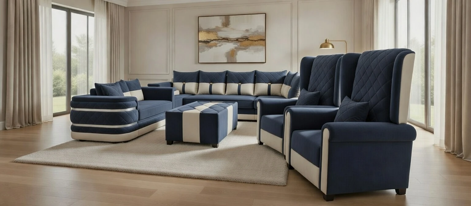 A majestic U-shaped sectional sofa set designed to create a bold statement in spacious living areas. Featuring diamond-quilted detailing, plush deep seating, sculpted armrests, and coordinated accent chairs, this collection blends comfort with contemporary sophistication. The matching tufted ottoman completes the ensemble, offering a perfect balance of luxury, warmth, and inviting family-friendly comfort.