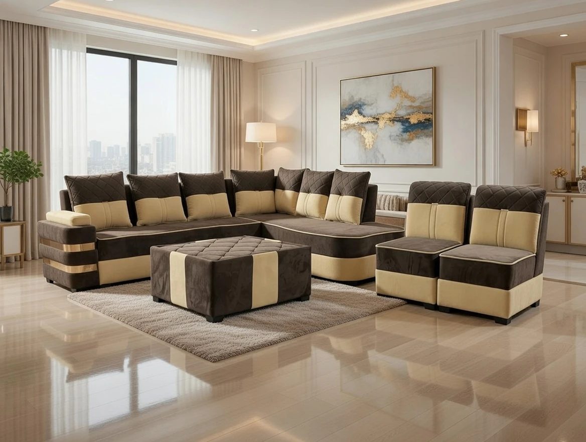 A refined blend of deep cocoa brown and soft beige tones, this elegant sectional sofa set delivers both comfort and contemporary sophistication. Designed with quilted back cushions, supportive seating, and sleek gold accent bands on the armrest, it creates a bold yet balanced aesthetic. The matching ottoman and accent chairs complete the ensemble, making it a perfect centerpiece for spacious living rooms that value warmth, style, and everyday luxury.
