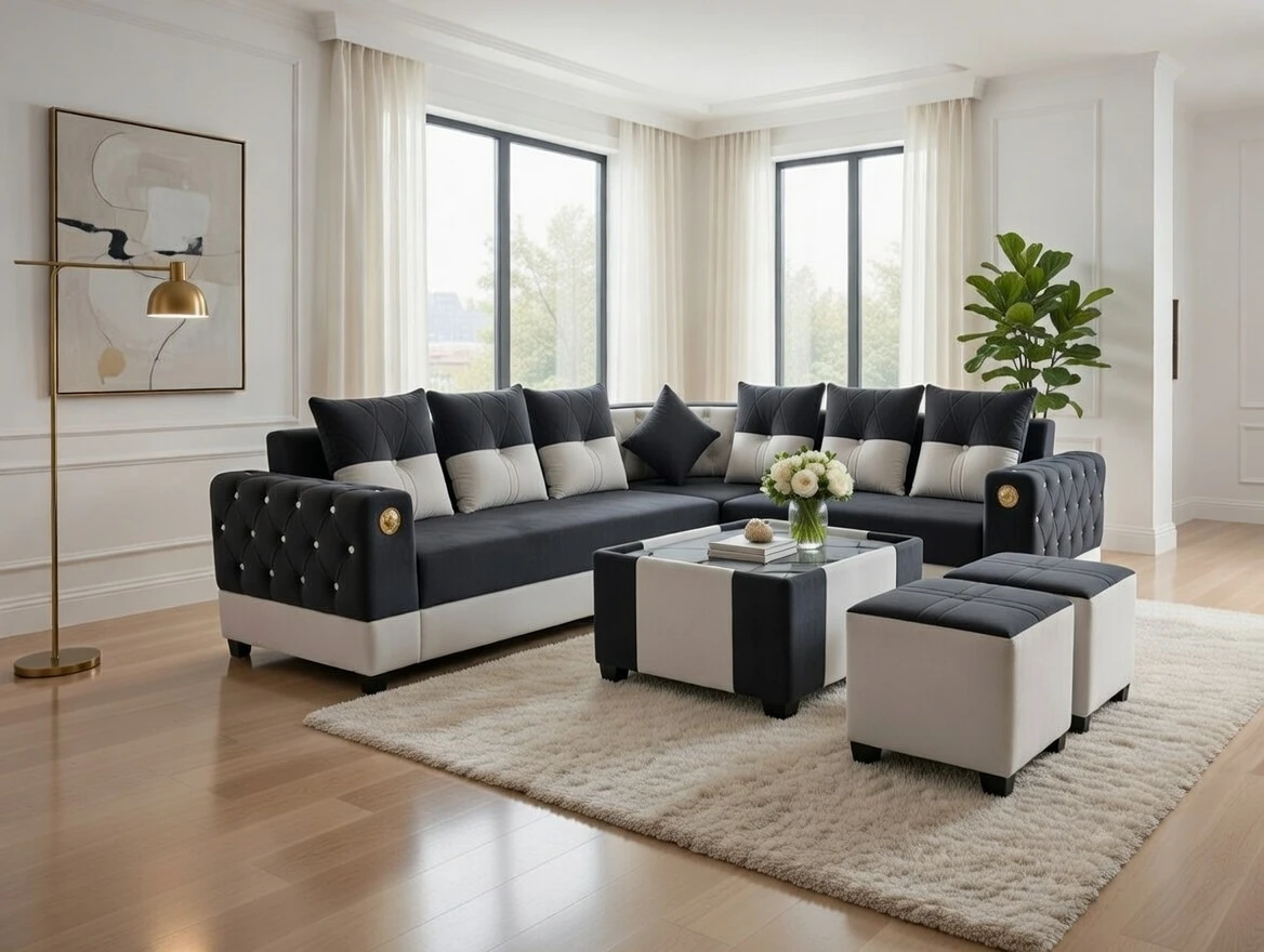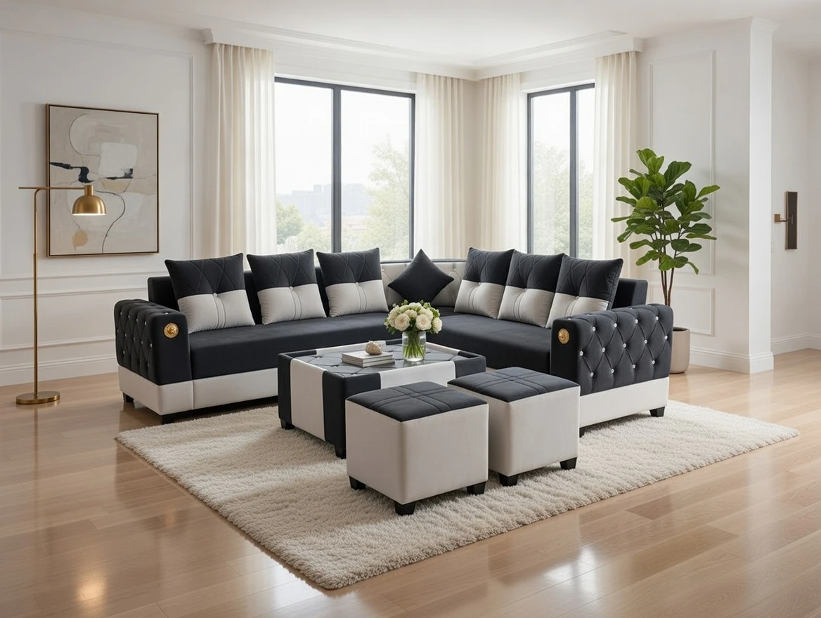 A stylish L-shaped sofa set featuring elegant tufted arm detailing, plush cushions, and a matching ottoman. Designed for both comfort and sophistication, this set creates a clean, contemporary focal point in any living space. The structured silhouette and premium finish make it ideal for relaxing, entertaining, and elevating modern interiors.