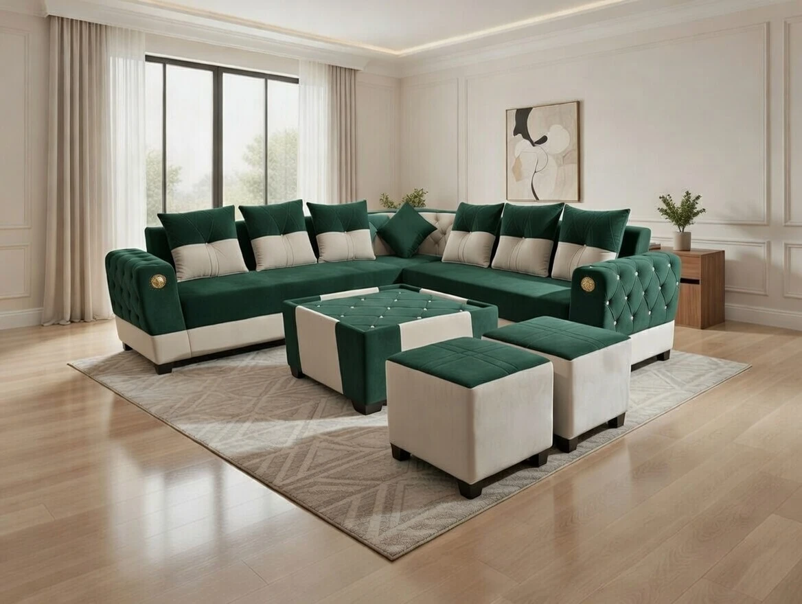 A stylish L-shaped sofa set featuring elegant tufted arm detailing, plush cushions, and a matching ottoman. Designed for both comfort and sophistication, this set creates a clean, contemporary focal point in any living space. The structured silhouette and premium finish make it ideal for relaxing, entertaining, and elevating modern interiors.