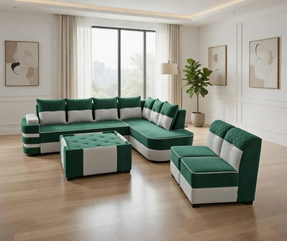 A refreshing blend of deep green and crisp white, this contemporary sectional sofa set brings a calm and stylish vibe to any living space. Designed with quilted back cushions, plush seating, and clean modern lines, it offers both elegance and everyday comfort. The matching ottoman and accent chair complete the coordinated look, making it a perfect choice for bright, airy interiors that value sophistication and relaxation.