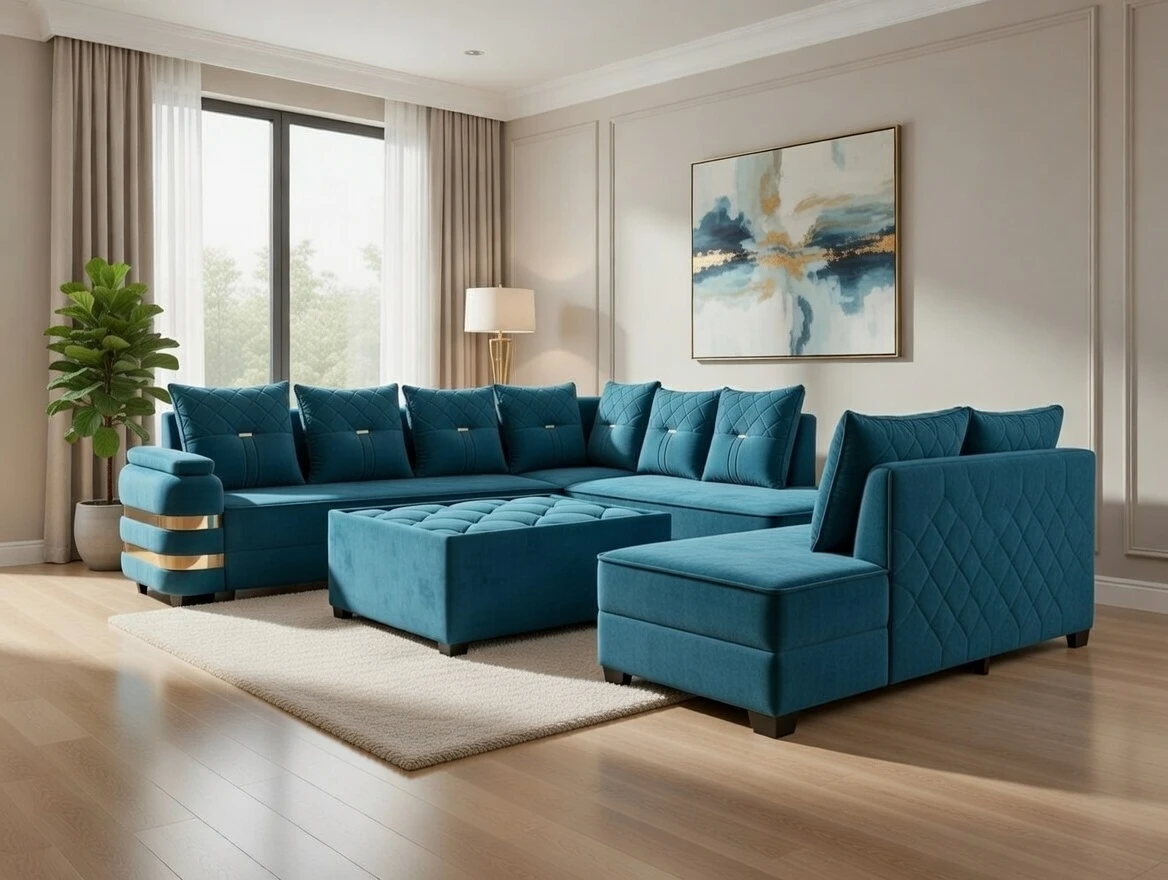 A stunning teal velvet sectional sofa set designed to bring sophistication and comfort into your living space. Featuring quilted detailing, plush cushions, and elegant gold accent bands on the armrests, this contemporary piece blends modern luxury with cozy functionality. Paired with a matching ottoman and armchair, it creates a harmonious and inviting atmosphere perfect for both relaxing evenings and stylish entertaining.